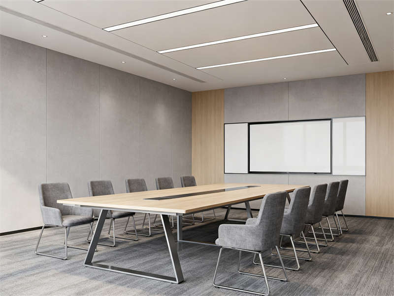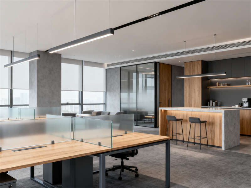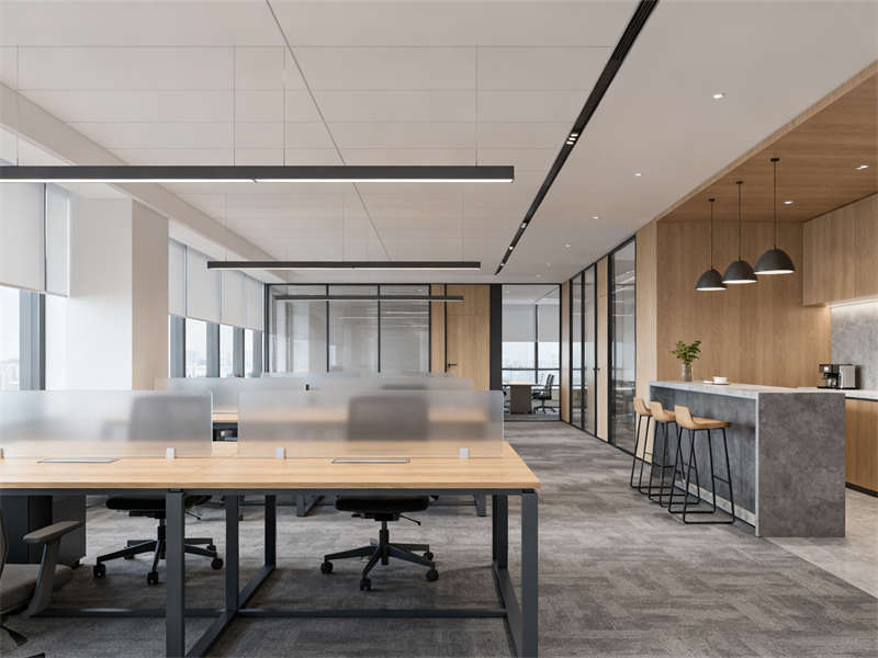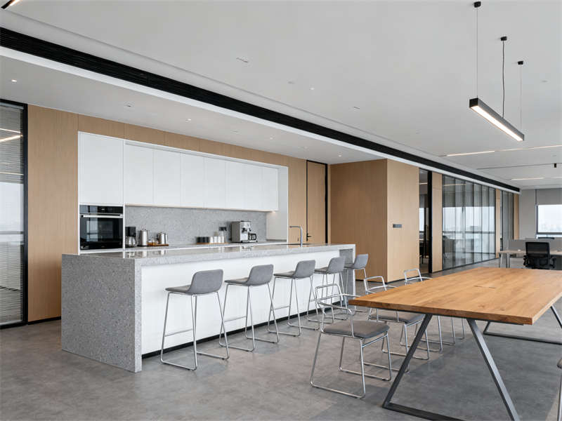 中型會(huì)議室圍繞協(xié)作功能展開(kāi),長(zhǎng)條式會(huì)議桌與玻璃隔斷搭配,既保證空間開(kāi)闊,又能與外部辦公區(qū)形成視覺(jué)聯(lián)動(dòng),灰色布藝座椅與頂部圓形吊燈呼應(yīng),讓會(huì)議場(chǎng)景兼具功能性與舒適感。茶水間則通過(guò)淺灰石英石臺(tái)面、木色護(hù)墻板與暖光燈帶,營(yíng)造輕松休閑的氛圍,成為辦公間隙的放松節(jié)點(diǎn)。